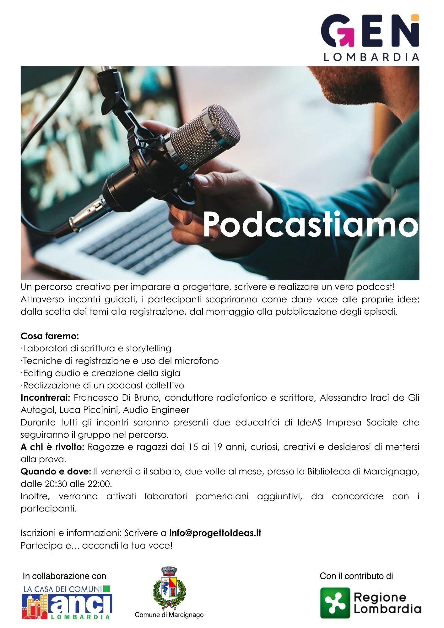 Si informano i cittadini che il Comune di Marcignago, nell’ambito del bando “La Lombardia è dei giovani 2025”, ha avviato con Ideas Impresa sociale il progetto “Podcastiamo”: un percorso creativo per imparare a progettare, scrivere e realizzare un vero podcast attraverso incontri programmati con esperti del settore.