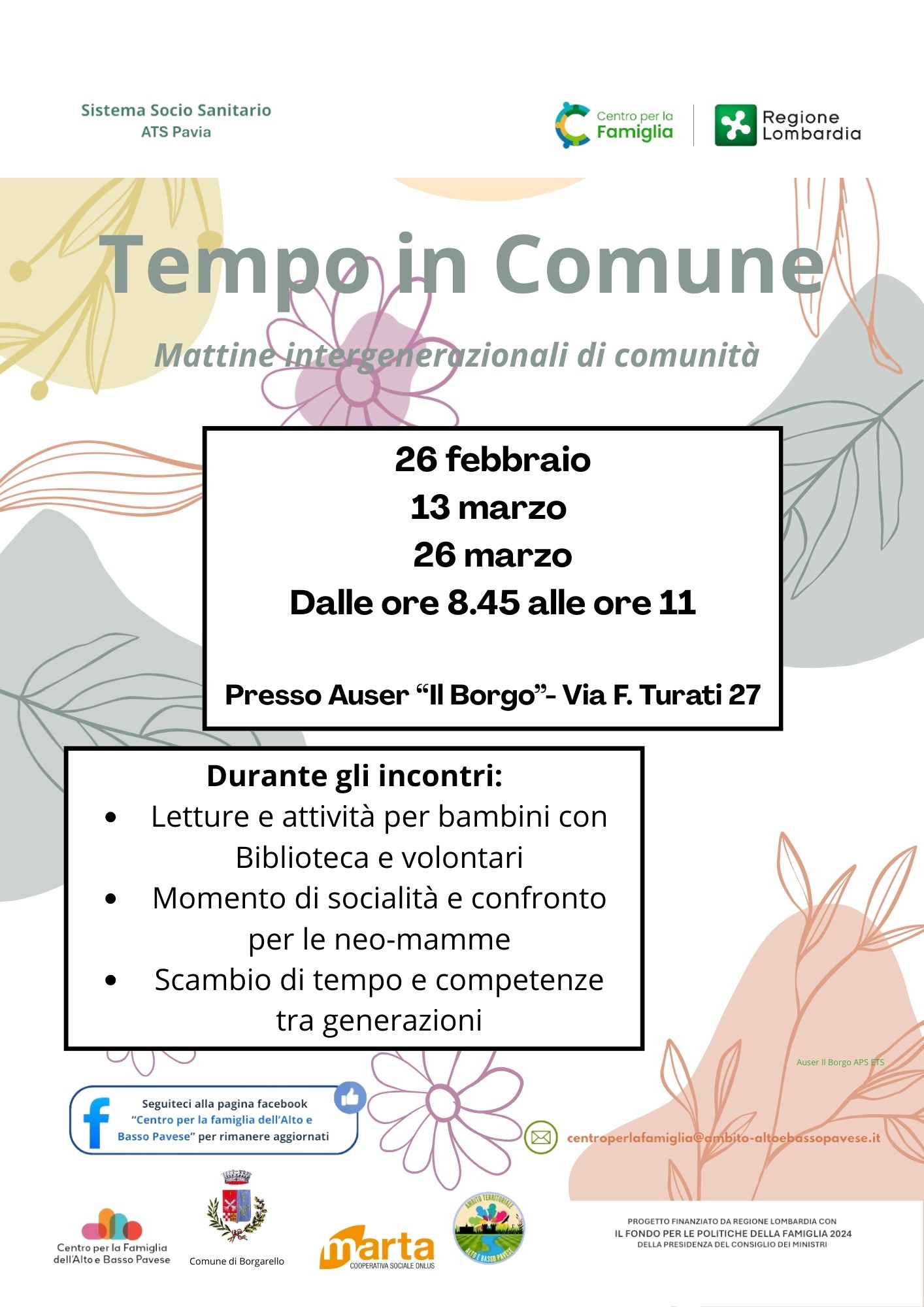 Un’iniziativa realizzata da Cooperativa Marta con la collaborazione del Comune di Borgarello, Biblioteca di Borgarello, Auser, ODV B612 e A Tutto Tondo nell’ambito del progetto Famiglie Solidali – Centro per le Famiglie dell’Ambito Territoriale dell’alto e del basso pavese.